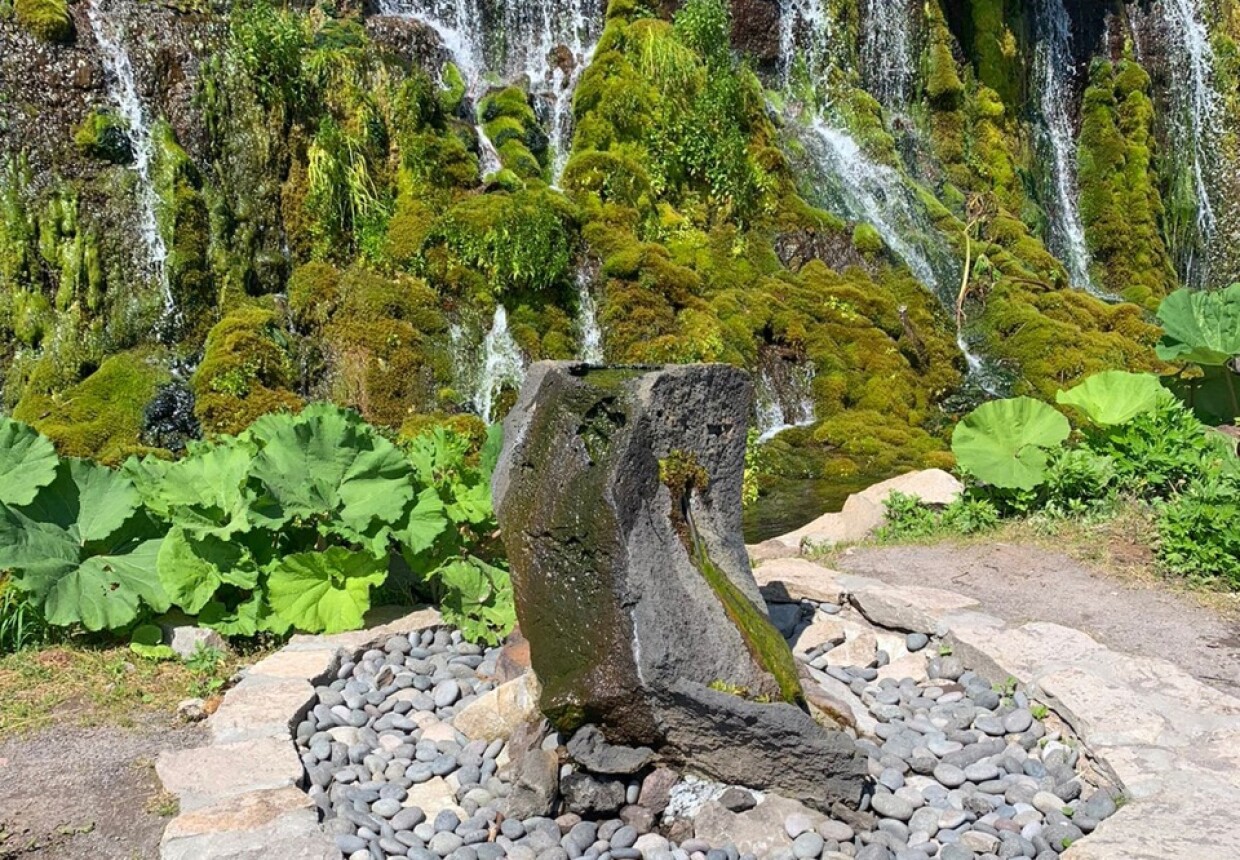 Далее мы с Вами отправляемся на плачущие скалы или стену водопадов. Очень живописное место. Всю скалу покрывает ярко-зеленый мох, по скалам стекает множество ручейков, которые впадают в ручей у подножия горы.