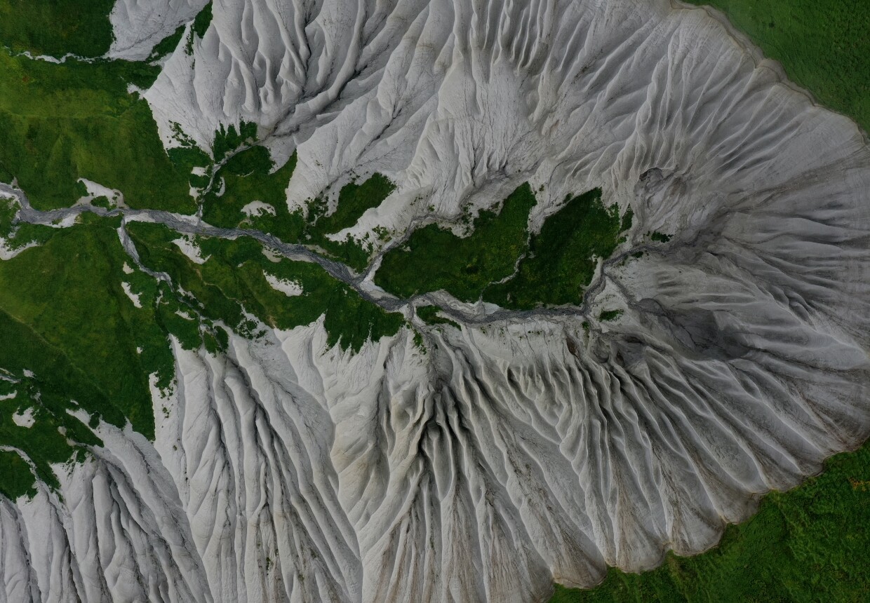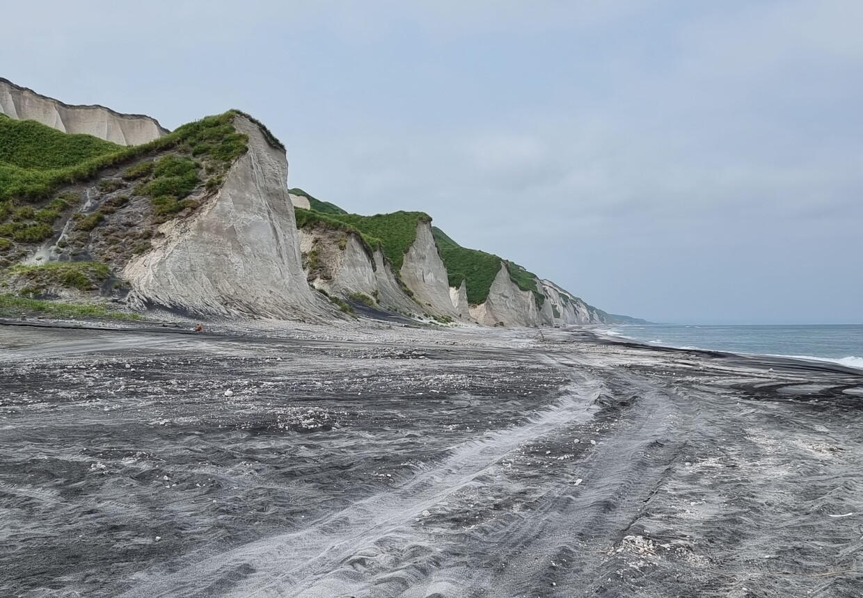 Белые скалы - потрясающее творение стихии в природе. Растянутые на 28 километров вдоль побережья Охотского моря на острове Итуруп горы, состоящие из мягкой пемзы образованной после извержения вулкана, поражают своей красотой. Особенное очарование этому месту придаёт изумрудная зелень, которая обрамила образовавшуюся композицию. Пемза претерпела сильную эрозию под воздействием штормов Охотского моря, дождей и многочисленных малых рек и ручьев, которые в итоге сформировали причудливые и изумительные формы скал. Песок прибрежной полосы смешанный: белый кварцевый и черный титано-магнетитовый. Наверное, от их соединения образуется его непривычный цвет.